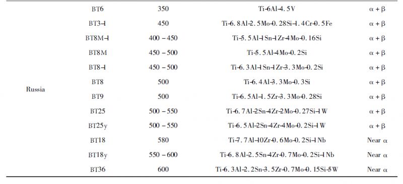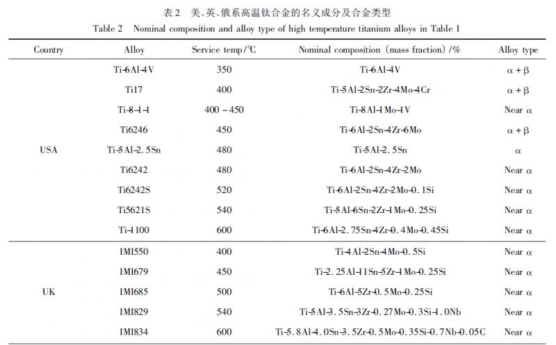 從20 世紀50 年代起到80 年代的近40 年,是國外高溫鈦合金的快速發(fā)展時期,使用溫度從最初的350℃提高到600℃。在此期間,美、俄、歐等航空發(fā)達國家均建立了各自相對獨立的高溫鈦合金材料體系[21,22],見表1 和表2。從合金設(shè)計理念來看,歐美發(fā)動機用高溫鈦合金注重蠕變性能,合金類型多為近α 型。在過去近30 年中,歐美的高溫鈦合金材料體系逐漸統(tǒng)一,發(fā)展成以Ti-6Al-4V,Ti-17,Ti6246,Ti6242S,IMI829 和IMI834 為主的材料體系。被淘汰的合金主要以500℃以下的α 型和近α型合金為主,這些合金力學(xué)性能相對于Ti6246 和Ti6242S 沒有明顯優(yōu)勢,而且存在保載疲勞和熱應(yīng)力腐蝕敏感性問題( 如IMI679,IMI685,Ti-8-1-1等)[4,23 ~ 26];俄系高溫鈦合金更注重高溫強度、表面抗氧化和熱穩(wěn)定性,以α + β 型合金為主。俄羅斯長期以來研制和應(yīng)用的高溫鈦合金牌號較多,推薦今后新型俄羅斯發(fā)動機集中選用BT22,BT6,BT8M-1,BT8-1,BT20,BT25у 和BT18у 等高溫鈦合金。
