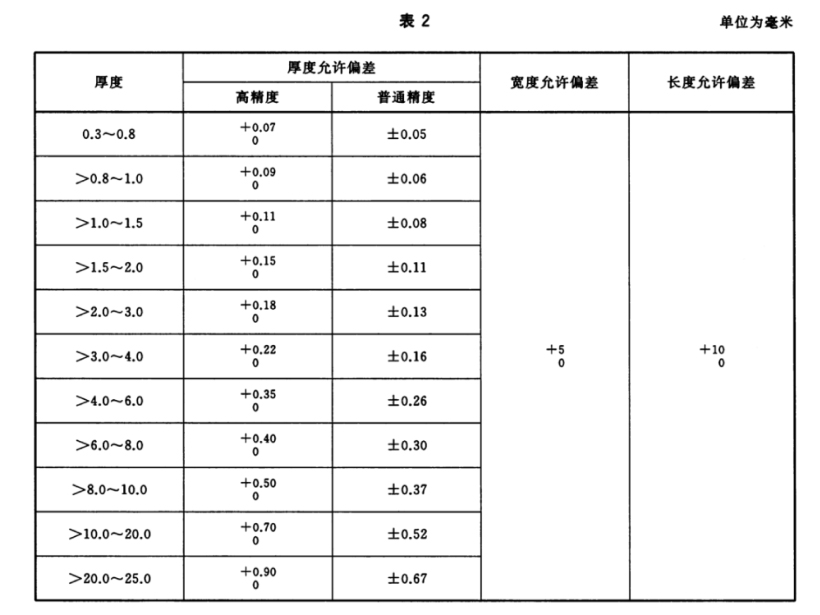 2.1 板材的厚度、寬度、長度允許偏差應符合表2的規定。